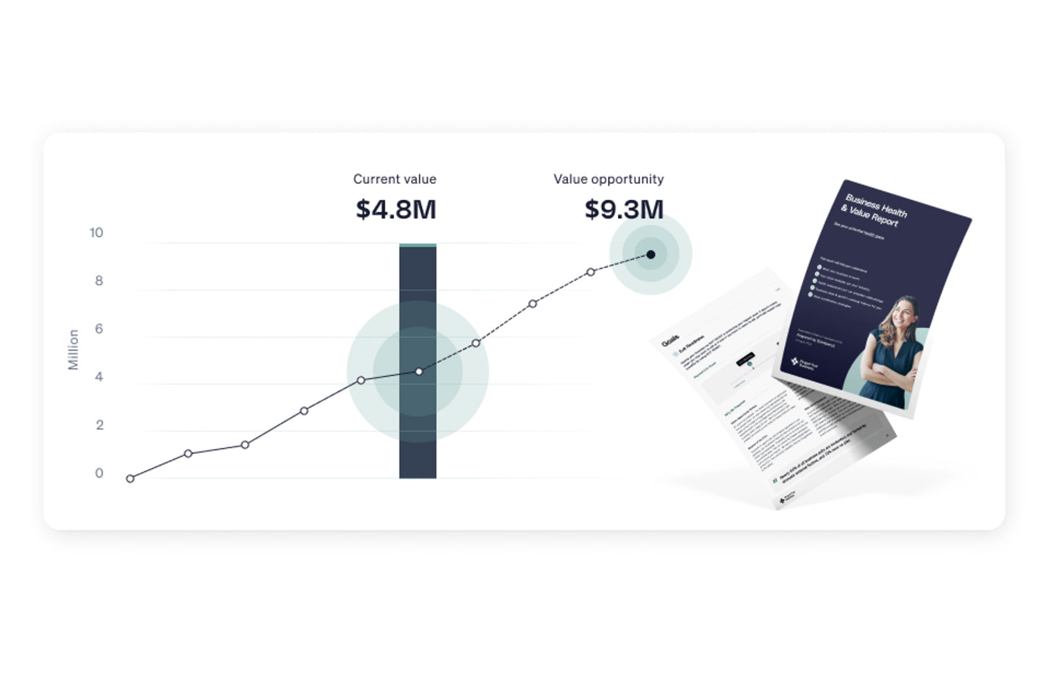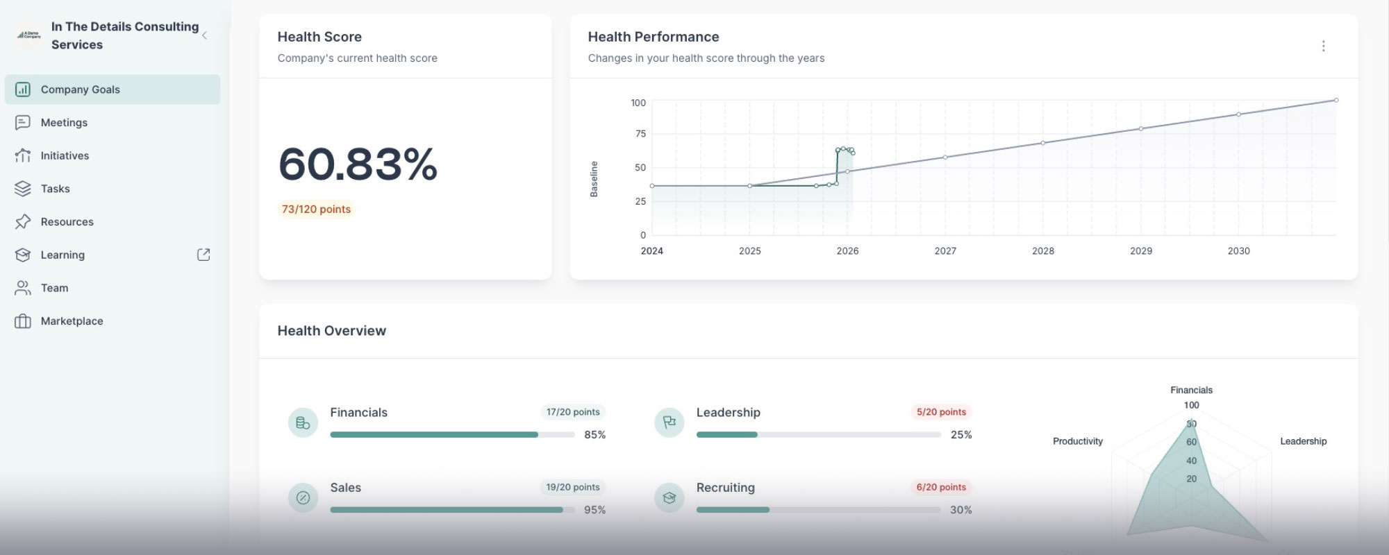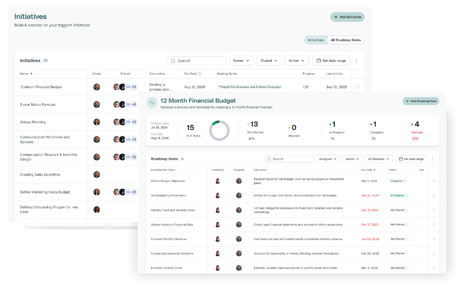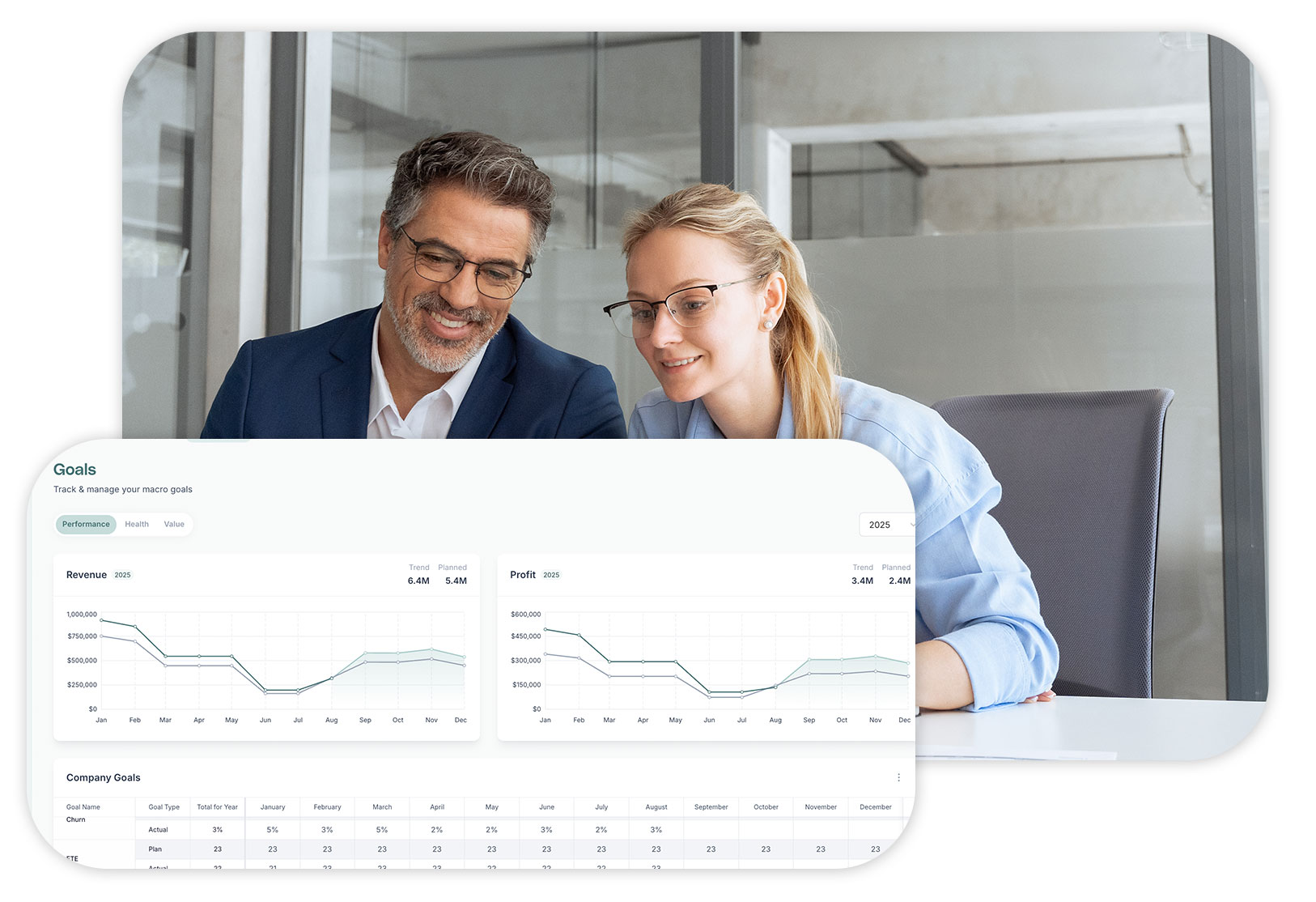 See the full picture of your client portfolio at a glance — goals, initiatives, and enterprise value for every business you support. Spot attrition risks, measure your impact, and showcase best-in-class ROI.